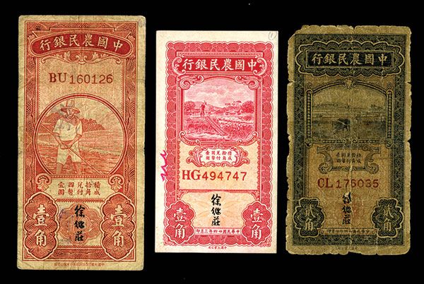 China, Lot of 3 notes, Includes 1934, 1 Chiao=10 Cents, P-451 S/M#C290-1, VF; 1935 Second Issue, 10 cents = 1 Chiao, P-455 S/M#C290-21), Uncirculated and 20 cents=2 Chiao, P-456, S/M#C290-22, VG with edge faults, useful banknote trio.