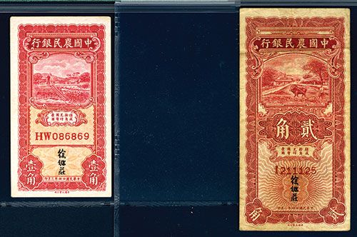 Lot of 2 notes, Includes China, 20 Cents= 2 Chiao, P-454 (S/M#C290-20), Issued banknote, red, PMG graded Very Fine 25 NET with note of rust; 10 Cents= 1 Chiao, P-455 (S/M#C290-21), Issued banknote, red, PMG graded Choice About Unc. 58 EPQ , attractive banknote pair. From The Allen Berk Collection.