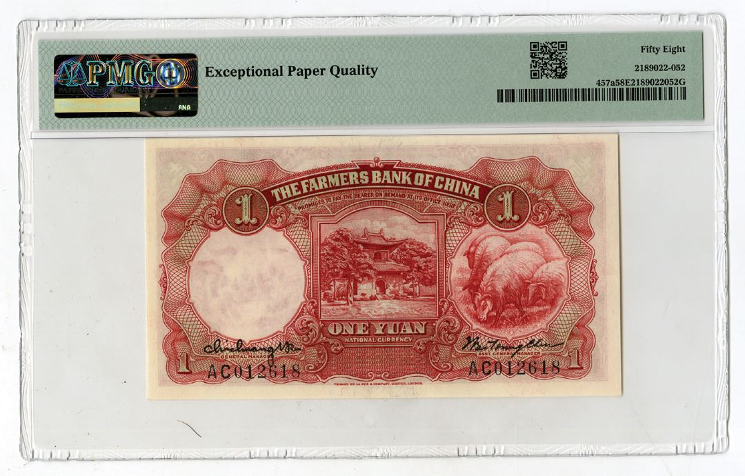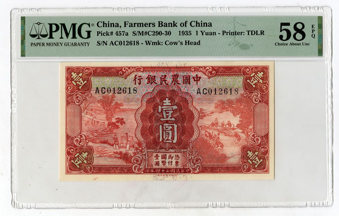 China, 1935. 1 Yuan, P-457a S/M#C290-30, Issued Banknote, Red on green and m/c underprint, S/N AC012618, PMG graded Choice About Uncirculated 58 EPQ, TDLR.