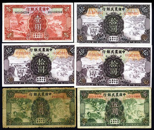 Lot of 5 notes, Includes 1 Yuan, P-457, Choice XF-AU; 5 Yuan, P-458a, VG and VF; 10 Yuan, P-459a (3), CU condition. All TDLR issues. From The Allen Berk Collection.