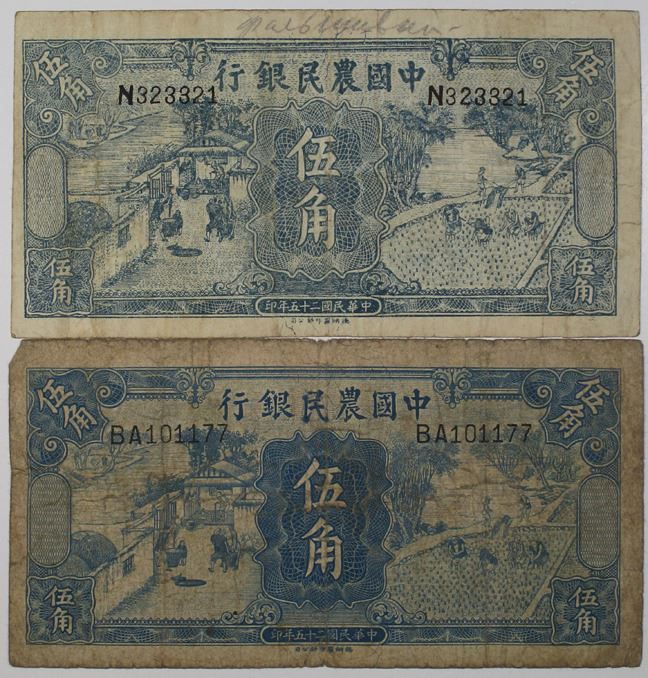 China, 1936. Lot of 2 notes, Both are 50 Cents, P-460), S/M#C290-40, Issued Banknotes, Blue with agricultural occupations at left and right, The note with S/N BA101177 is authentic and in Choice VG to Fine condition; the note with S/N N323321 on lighter paper is a contemporary counterfeit, Printer: TDLR. (2). Sold "AS IS" no returns accepted.