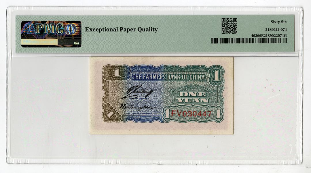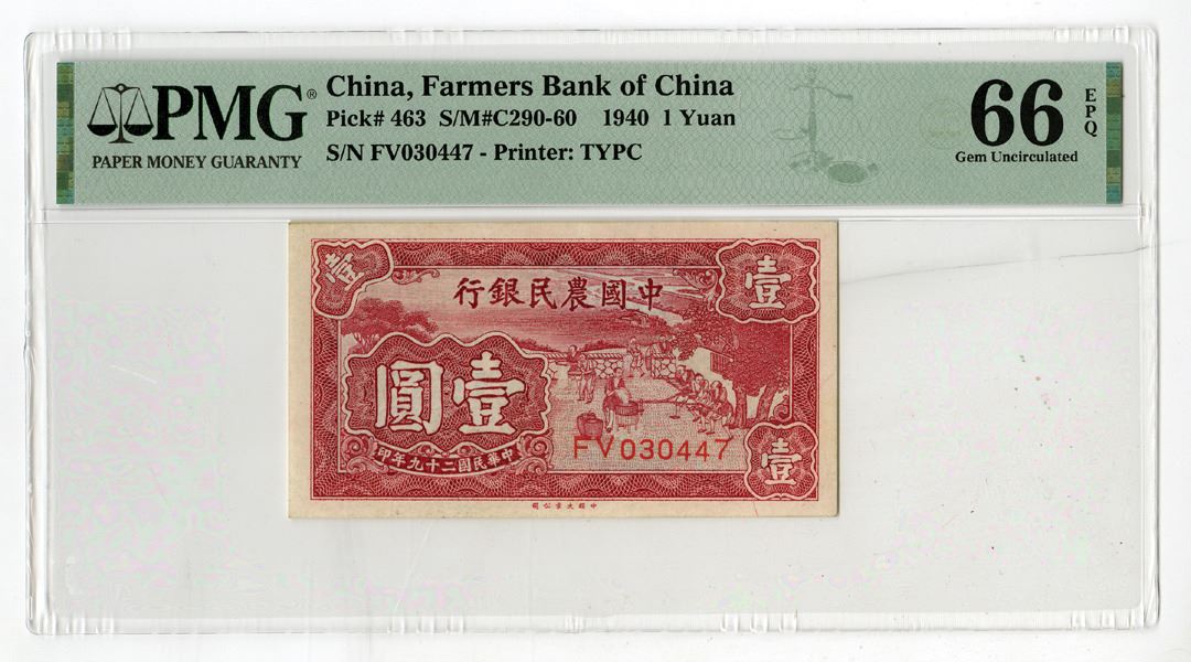 China, 1940. 1 Yuan, P-463 S/M#C290-60, Issued Banknote, Red printing, Workers at right, S/N FV030447, PMG graded Gem Uncirculated 66 EPQ, TYPC.