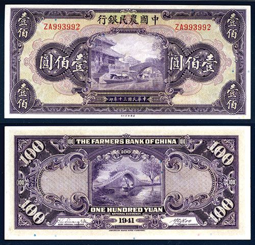 1941, 100 Yuan, P-477a (S/M#C290-83b), Issued banknote, purple on m/c, canal with boats, bridge and building, back purple, S/N ZA993992, S/N on face only, PMG graded Choice Uncirculated 64, Attractive note that offers a Gem appearance and is graded very conservatively, ABNC.