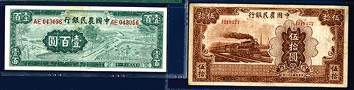 Lot of 2 notes, Includes China, 50 Yuan, P-479 (S/M#C290-90), Issued, Brown with locomotive, PMG graded VF 25; 100 Yuan, P-480 (S/M#C290-91), Issued, Green with agricultural scene, PMG graded Choice XF 45. From The Allen Berk Collection.