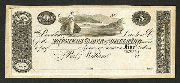 Port William, Kentucky. $5, Proof, KY-270-UNL, Unlisted variety in Haxby, black without under print, woman standing by shoreline overlooking large river un middle, AU, mounted to thin brown card, no printer imprint.