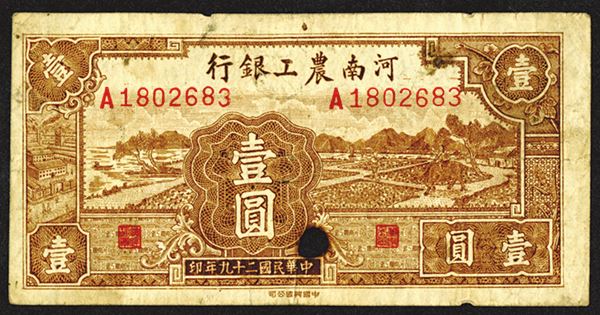 China, 1 Yuan, P-Unlisted, Brown face, back blue, Issued banknote. Fine with a small burn hole on the bottom middle.