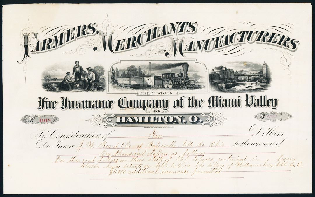 Hamilton, Ohio, 1873, $1000 Insurance on a stock of leaf tobacco, #4918, Black print with ornate title, Three ABNC vignettes below title Farmers sitting on wheat on left moving locomotive leaving town center and falls with mill and trestle on right, Fine condition with folding creases, ABNC.