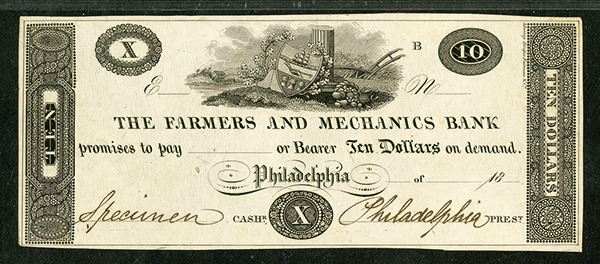 Philadelphia, Pennsylvania, 18xx (ca.1820-30's), $10, Plate B, PA-430-G30, SENC, Unlisted in census, Proof banknote, black on india paper, Pennsylvania Arms in middle with plow, fruits and vegetables resting against a Greek column, Specimen and Philadelphia written in signature blocks, PMG graded About Uncirculated 50 condition, Murray, Draper, Fairman & Co. Imprint. (resilver City Collection, AIA Sale VIII)