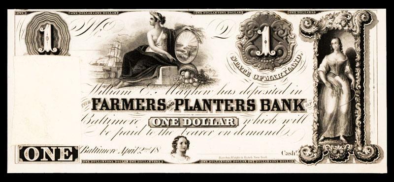 Farmers and Planters Bank Baltimore, ca.1830's Obsolete Proof.Baltimore, Maryland, 18xx (ca.1830's), $1, Plate D, MD-65- Unlisted Certificate of Deposit, Unlisted in census, Proof banknote, Banknote printed in black on india paper on thin white card, Allegorical seated woman watching sailing ship with cornucopia with produce and shield with sunrise, right with young woman standing in ornate numeral 1. Uncirculated with the left vignette removed by the printer leaving a 1.25 by 1.75 inch space on left. Rawdon, Wright & Hatch New York imprint. (Silver City Collection, Part 1)