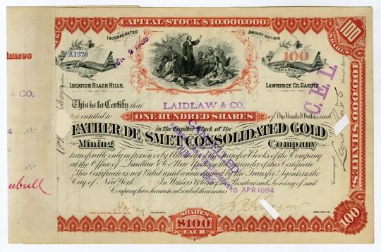 Location Black Hills, Lawrence Co., Dakota Territory, 1884. 100 Shares Capital Stock I/C Certificate, Black on red border, Preacher with Native People at top, Multiple cancelled stamps on face and cut cancelled, Fine-VF condition, ABNC.