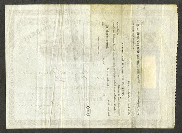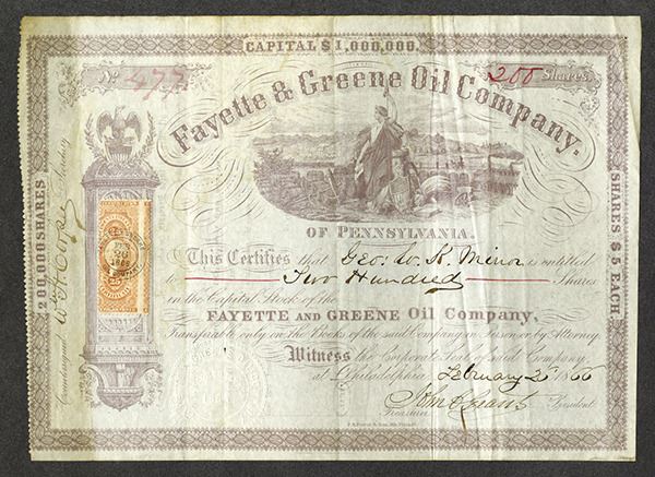 Pennsylvania, I/U. 200 Shares, Purple, Standing Liberty overlooking progress, 25cts IR stamp on left, S/N 477, Stain on left margin, Fine to VF. Scarce early Pennsylvania oil company.