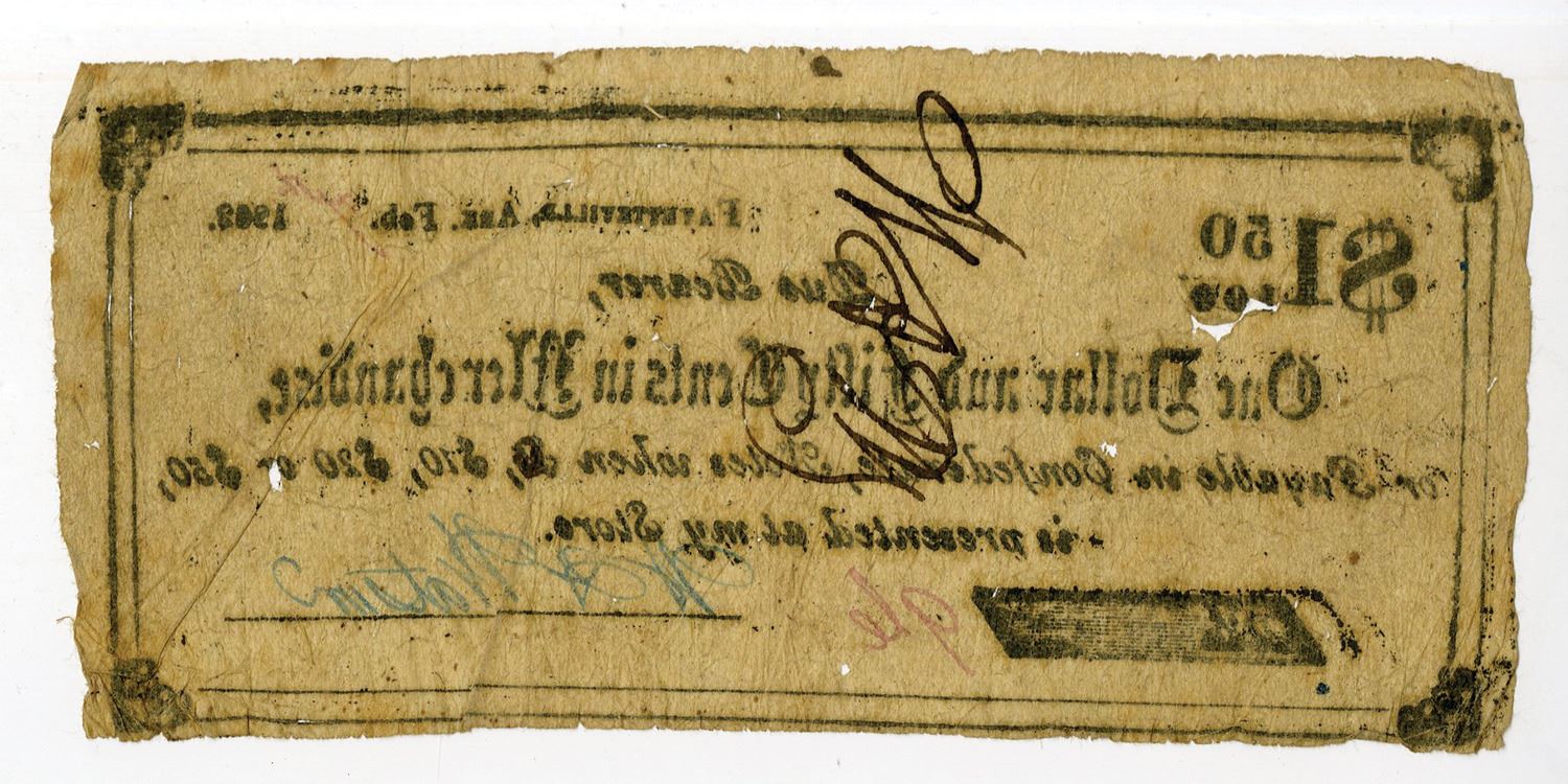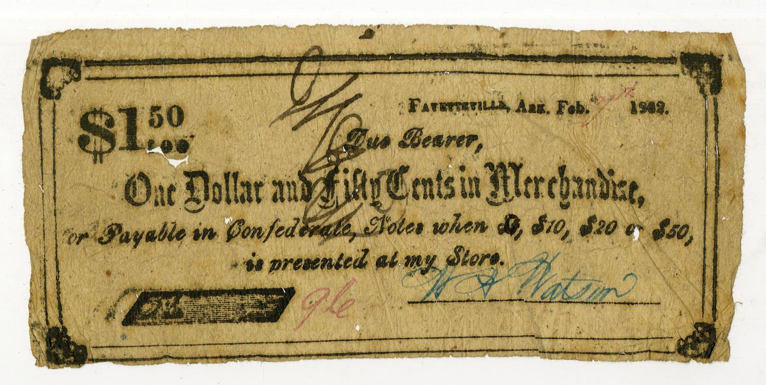 Fayetteville, Arkansas. February 7, 1862, W.A. Watson. $1.50, Unlisted denomination in Rothert (Rothert 204-?), Issued obsolete scrip note, Dated February 7th, 1862, Black text "Payable in Confederate Notes when $10, $20 or $50 is presented at my store.", Signature in blue ink at bottom right, Printed on tissue thin paper with Ink bleed from initials on back in black, S/N 96, Fine to Choice Fine condition with toning, pin holes or internal damage due to the fragile nature of the paper. No examples have been found to be offered previously at auction. Extremely rare if not unique denomination for this issuer.