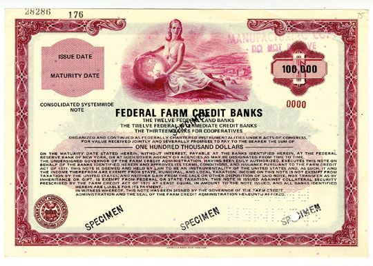 Washington D.C.. $100,000 Specimen Odd% Consolidated System wide Bond, Black print on purple border and under tint in small sized certificate, Allegorical woman leaning on globe at top, Specimen overprints and POC's, VF-XF condition, ABNC. This should be considered a U.S. Federal Bond that was issued by an Act of Congress in the Farm Credit Act of 1971.