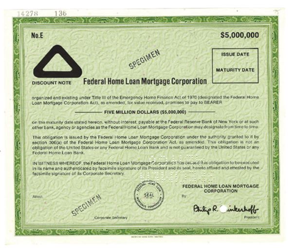 Washington D.C.. $5,000,000 Specimen Odd% Series E Discount Bond, Black print on green border and under tint, Company title at top, Specimen overprints, Pin punched cancelled, and POC's, VF-XF condition, ABNC.
