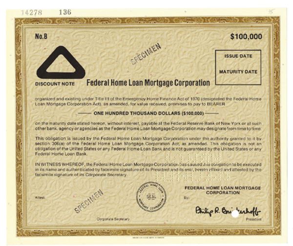 Washington D.C.. $100,000 Specimen Odd% Series B Discount Bond, Black print on brown border and under tint, Company title at top, Specimen overprints, Pin punched cancelled, and POC's, VF-XF condition, ABNC.