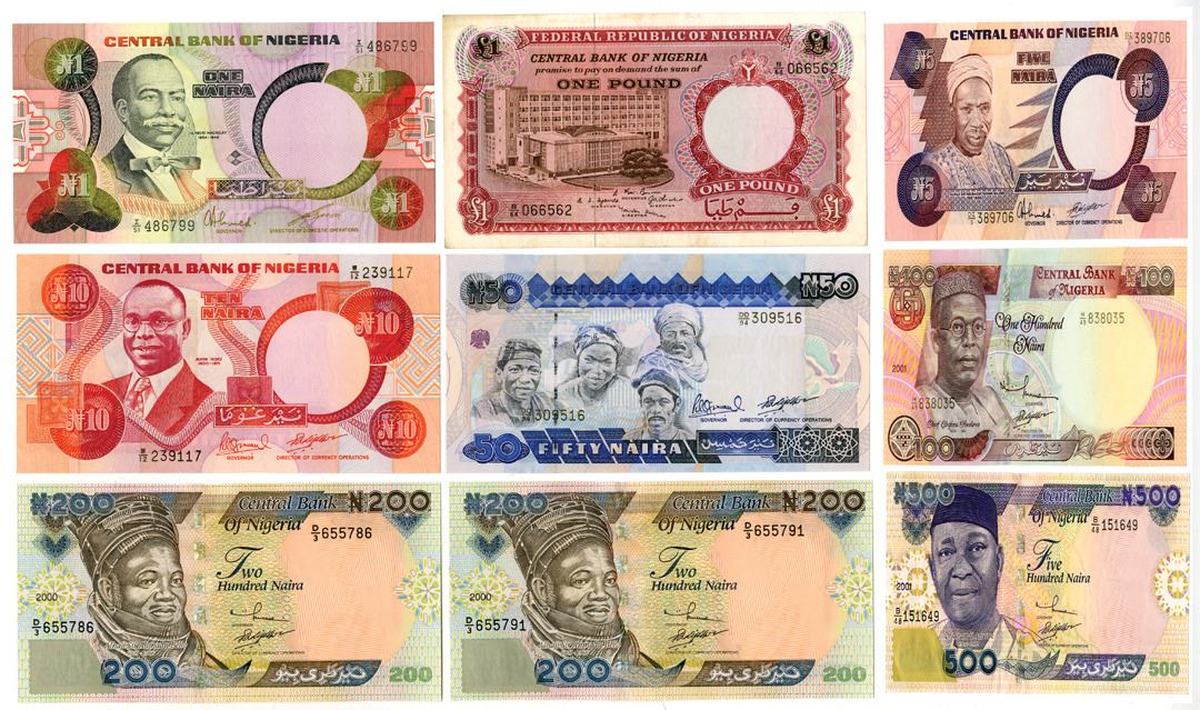 Nigeria...., ND (1967)-2001. Lot of 9 Issued Banknotes, Includes: Federal Republic of Nigeria 1 Pound, P-8; 1 Naira, P-23a; 5 Naira, P-24b; 10 Naira, P-25e; 50 Naira, P-27c; 100 Naira, P-28c; 200 Naira, P-29a (2); 500 Naira, P-30a. Notes range from VF-AU condition. (9). Sold "AS IS" no returns accepted.