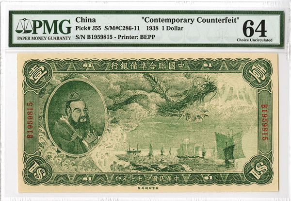 China. Contemporary Counterfeit $1, P-J55, S/M#C286-11, PMG graded Choice Uncirculated 64 EPQ. Rare note in high grade.