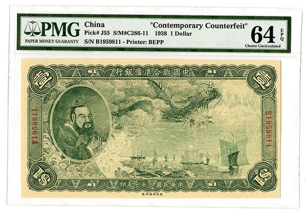 China. Counterfeit 1 Dollar, P-J55, S/M#C286-11, PMG graded Choice Uncirculated 64 EPQ.