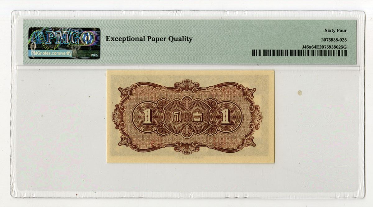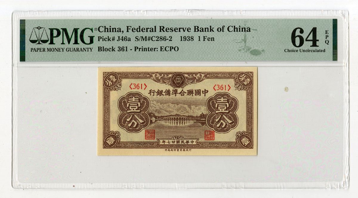 China, 1938. 1 Fen, P-J46a S/M#C286-2, Issued Banknote, Brown printing with bridge over river at center, Back is brown with denomination at left and right, Block 361, PMG graded Choice Uncirculated 64 EPQ, ECPO.
