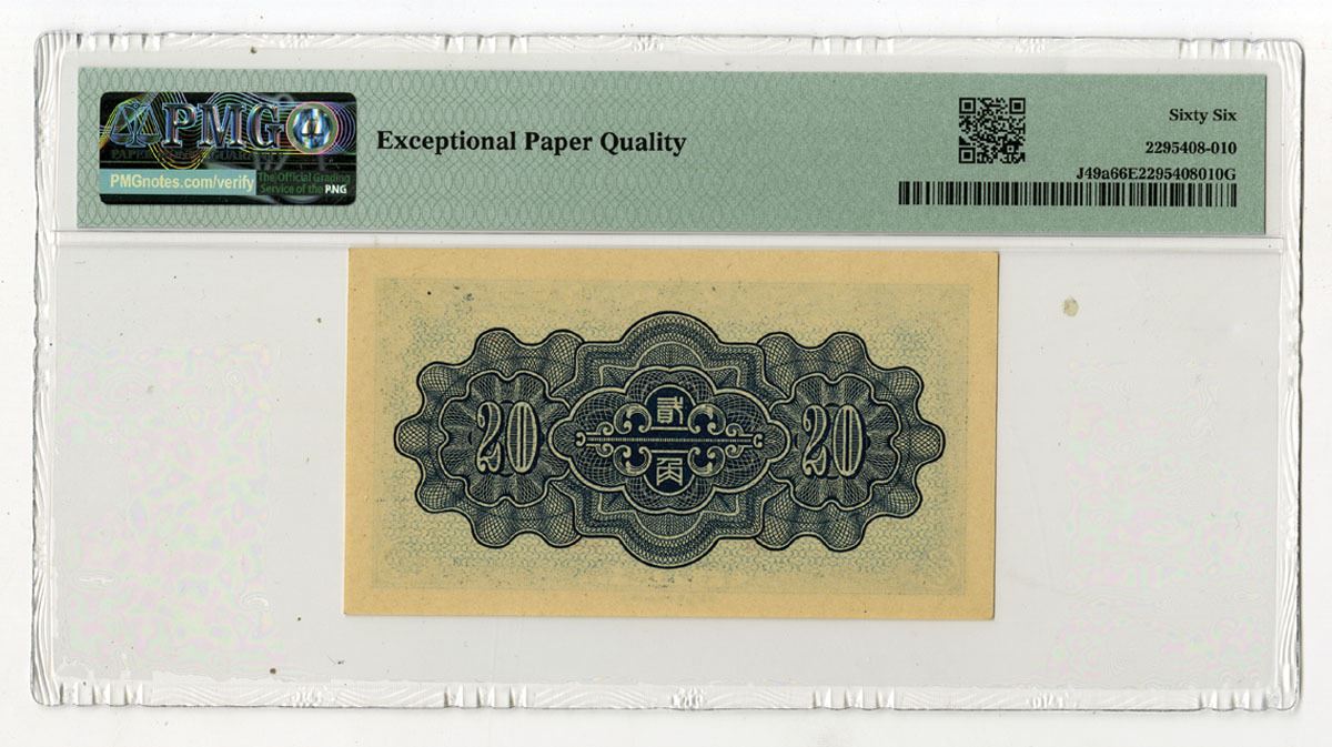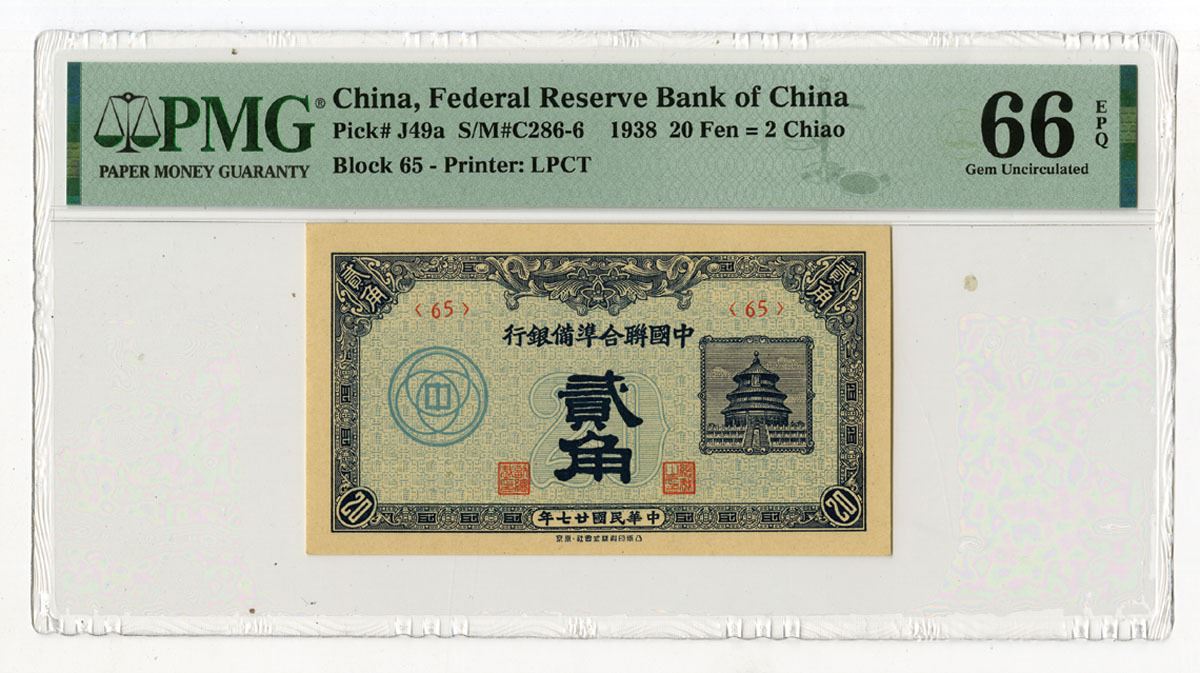 China, 1938. 20 Fen = 2 Chiao, P-J49a S/M#C286-6, Issued Banknote, Blue on pale blue underprint with Temple of Heaven at right, Back is dark blue, Block 65, PMG graded Gem Uncirculated 66 EPQ, LPCT.