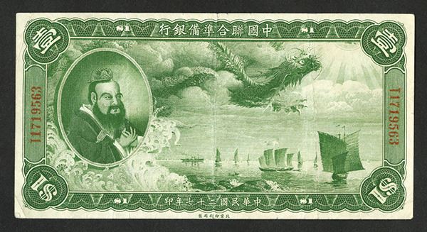 China. 1938, $1 green, P-J54, (S/M #C286-10), Green with Confucius on left with dragons and ships, back with dragons and seals, note appears very fresh. Choice VF with bright colors, sharp corners and large even margins. BEPP.