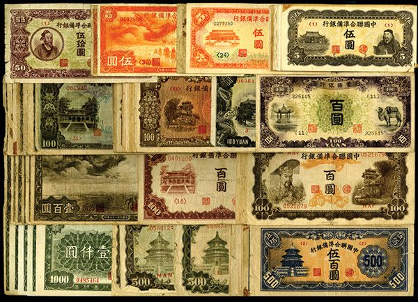 China, Lot of 80+ notes, Includes FRBC Issues, 1944 Issues, 100 Yuan, P-J59; 1939 Issue, 5 Yuan, P-J62; 1941, 5 Yuan, P-J73 and 100 Yuan, P-J75; 1943 ND Issue, 100 Yuan, P-J77; 1944 ND Issues, 5 Yuan, P-79; 100 Yuan, P-J83; 500 Yuan, P-J84; 1945 ND Issues, 50 Yuan, P-J87; 100 Yuan, P-J88; 500 Yuan, P-J90; 1000 Yuan, P-J91, Great Wall Issue (5); Mengchiang Bank, 100 Yuan and CBM, 100 Yuan, P-J133. Attractive and unsearched assortment for varieties and types, notes range from VG to AU-Unc. Sold "As is", no returns accepted.
