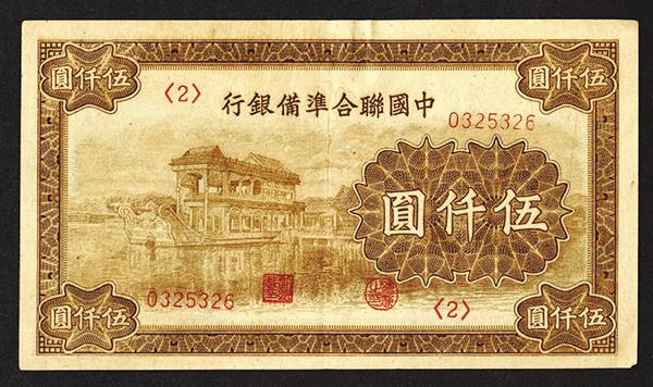 China, 5000 Yuan, P-J92a, S/M#C286-95, Issued banknote, Brown, State Stone Barge on left, Choice VF to XF, crisp paper, large even margins and bright colors enhance this lovely note, Block 2, S/N 0325326, Rare in this high of grade. (The Pogrebetsky Family Archives)
