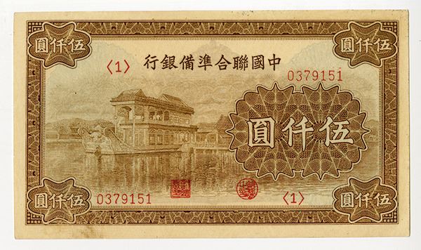 ChinaÉ. 5000 Yuan, P-J92a, S/M#C286-95, Issued banknote, Brown, State Stone Barge on left, AU to Uncirculated, crisp paper, large even margins and bright colors enhance this lovely note, Block 1, S/N 0379151, Rare in this high of grade.