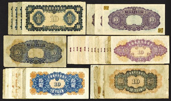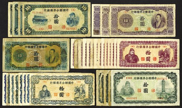 China. Japanese Influence. 10 Yuan. Various issues. P-J74a (5); J56a (4); J80 (7); J81 (3); J86a (8), b (6). Mostly Fine to Very Fine, some with rough edges. Just a few better. 33 pieces.
