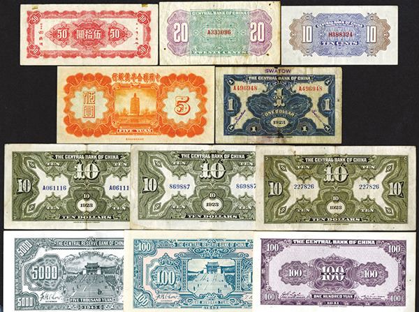 China, Japanese Puppet Banks. 10, 20, 50 Cents; 1, 10, 50, 100, 5000 Yuan or Dollars. P-171e; 176a; 193; 194; 195; 243b; 273; J23, J41, J62a. S/M 286-14; 305-14; 12a; 13b; 31; 33; SYS on some, Temple or other scenes on others. Many EF to AU. 11 pieces.
