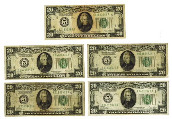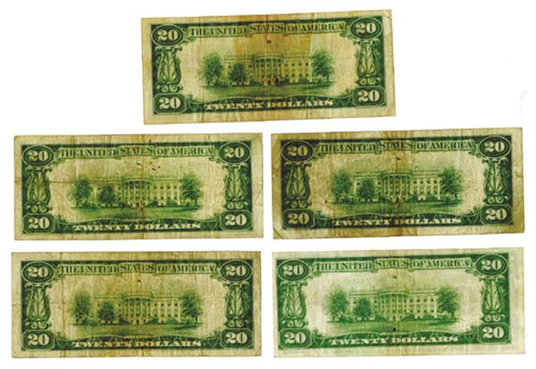 Includes 20 Dollars 1928 Richmond (3 pcs); and 20 Dollars 1928A Richmond (2 pcs). Generally Fine.