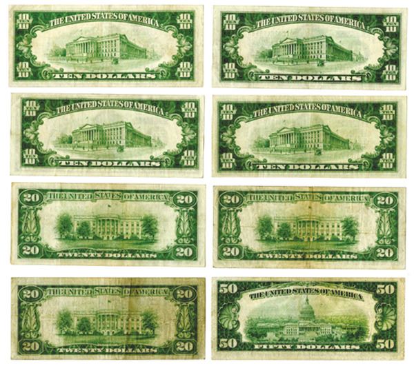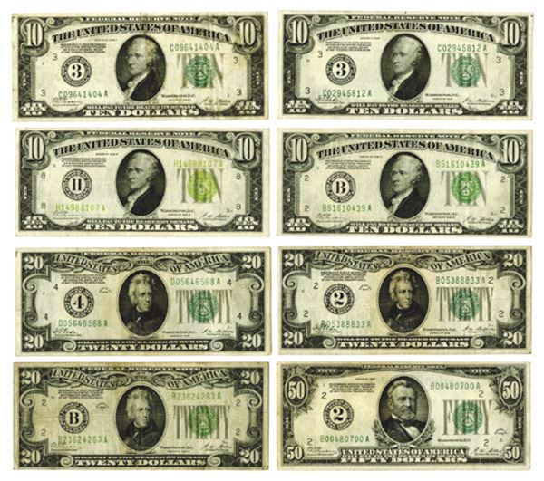 Includes 50 Dollars 1928 New York; 20 Dollars 1928 Cleveland & New York; 20 Dollars 1928B New York; 10 Dollars 1928 Phildelphia; 10 Dollars 1928A Philadelphia; and 10 Dollars 1928B St. Louis & New York. Generally Fine to Very Fine. ($150 Face)