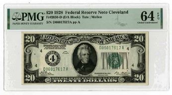 F.R.N., Cleveland, $20 Fr# 2050-D 1928, Tate | Mellon Signatures, S/N D06017617A, PMG graded Choice Uncirculated 64 EPQ