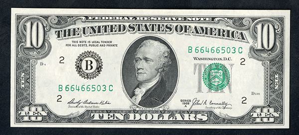 United States, FRN, $10, 1969 A, dramatic error with obverse printing offset on reverse. Choice Uncirculated.