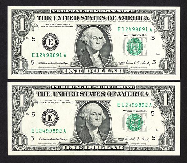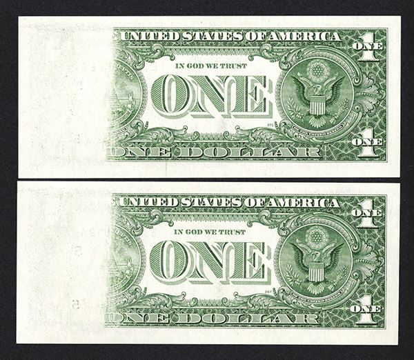United States. Series 1988 $1. With about 20% of the back white due to poor inking/wiping of the plate. Consecutive serial #. Uncirculated. 2 pieces.