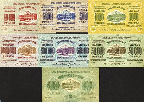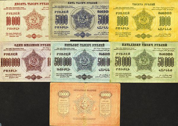 Russia - Transcaucasia. 1000, 5000, 10,000, 50,000, 500,000, 1,000,000 Rubles. P-S611, 612, 613, 616a, 619a, 620a. Mostly Choice About uncirculated to Uncirculated, one with old hinge mount remnants; 10,000 Rubles, P-S762c. Fine with old hinge repairs. 7 pieces. (The Silicon Valley Collection)