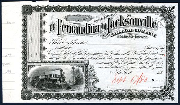 Florida. 1880. Stock Proof. Black print with black ornate border and vignette of locomotive bottom left. POC's. ABNC. Listed proof and railroad in Cox. Rare Florida railroad.
