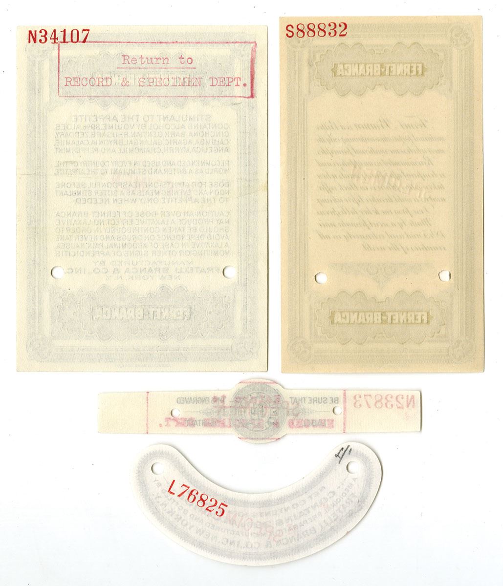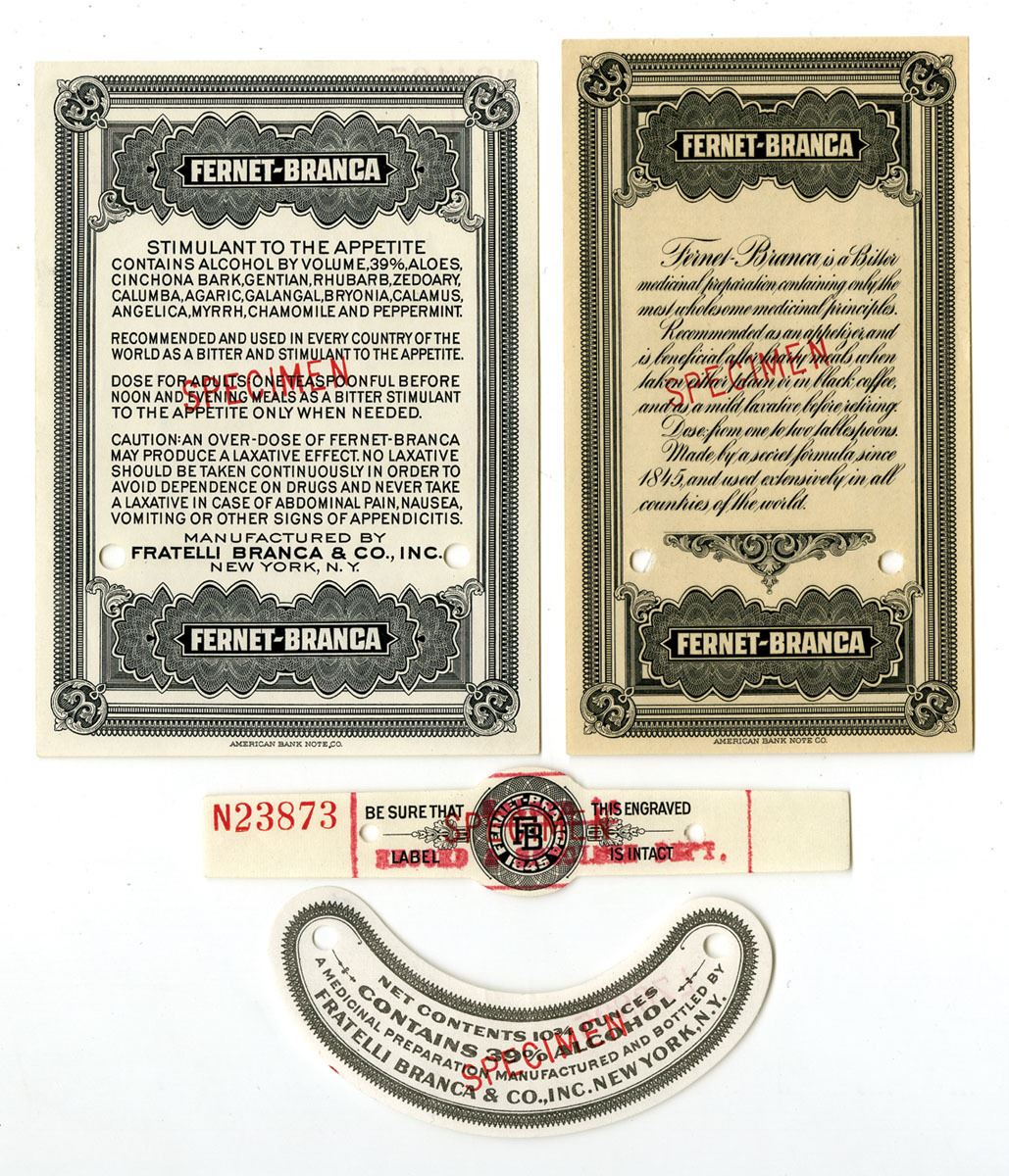 Lot of 4 Unused and Specimen Labels for Fernet-Branca curved neck label (SPECIMEN); Fernet-Branca back label proof with ornate engraved border (SPECIMEN); Fernet-Branca large detailed back label with full product description (SPECIMEN); and Fernet-Branca red-seal strip label with serial number N23873. These are original engraved label proofs produced for Fratelli Branca & Co., Inc., New York, showing classic mid-20th century liquor label design with crisp intaglio printing, decorative frames, and bold SPECIMEN overprints. Conditions are Excellent overall with minor handling from storage. (4). Sold “AS IS” no returns accepted.