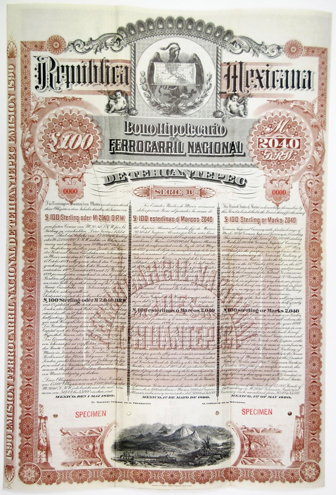 Tehuantepec, Oaxaca, Mexico. 1890, Specimen £100 Sterling = 2040 Marks, Series B, Black on brown border and undertint, Mexican Arms at top with map, possibly of the railroad route, bottom with small train traveling through tropical countryside with mountains, VF condition with a couple light areas of archival reinforcement at folds, ABNC. Rare bond with only 3 found in the ABN Archives, both pictured in Cox are from that find. These are the only ones available.
