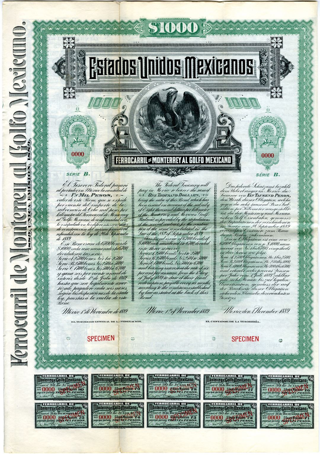 Mexico, 1889. Railroad from Monterrey to the Mexican Gulf, 1000 Pesos Specimen 6% Coupon Bond in Spanish, English, and German, Black text with green border and undertint, Coat of Arms of Mexico at top center. Red specimen overprints, 0000 serial numbers, and POCs. Fine to VF condition with an archivally repaired split down center. This is the only bond listed for the railroad in Cox and the only example found in the ABN Archives.