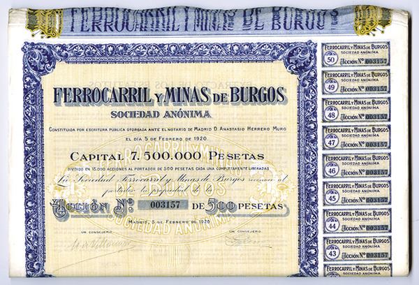 France. 50 Pieces. 500 Pesetas Issued Bond, Blue print on large blue border with yellow under tint printed in French, Company title at top with coupons on bottom, VF-XF condition.