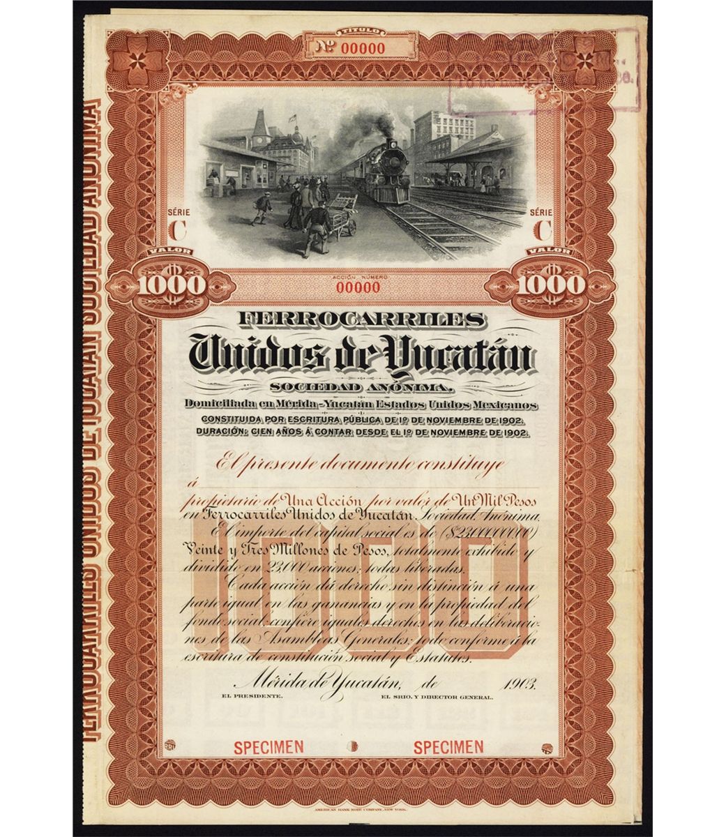 Yucatan, Mexico. 1903. 1000 Pesos. Specimen Stock- Bond with coupons for dividends attached. Red-brown border. Vignette of Locomotive at station. Red SPECIMEN overprint and POC. VF Condition. ABNC. Rare Yucatan railroad bond.