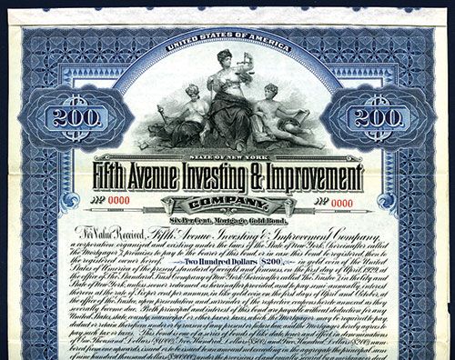 New York, 1909, $200, 6% Mortgage Gold Specimen Bond, Black on blue border and underprint, Three allegorical figures top center, POC's, VF condition, ABNC.
