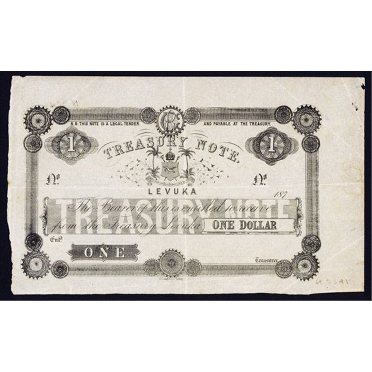 Levuka, Fiji, 187x, (ND), $1, P-14r, Unissued, Black on white paper, Arms of Fiji in middle, No serial Numbers, (No.3241 handwritten on back), folded, VF to Choice VF, rare note in any condition or format. Printer: S.T.Leigh, Sydney.