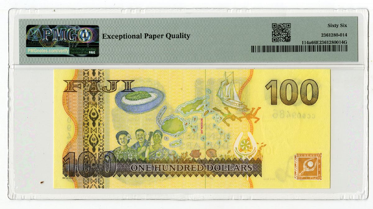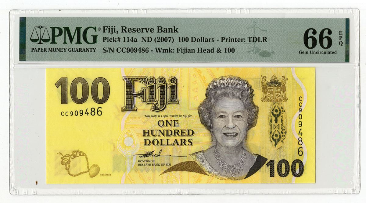 Fiji, ND (2007). 100 Dollars, P-114a, Issued Banknote, Brown on yellow underprint with portrait Queen Elizabeth II at right, Back is yellow and m/c with Native people and map of islands at left, S/N CC909486, PMG graded Gem Uncirculated 66 EPQ, TDLR.