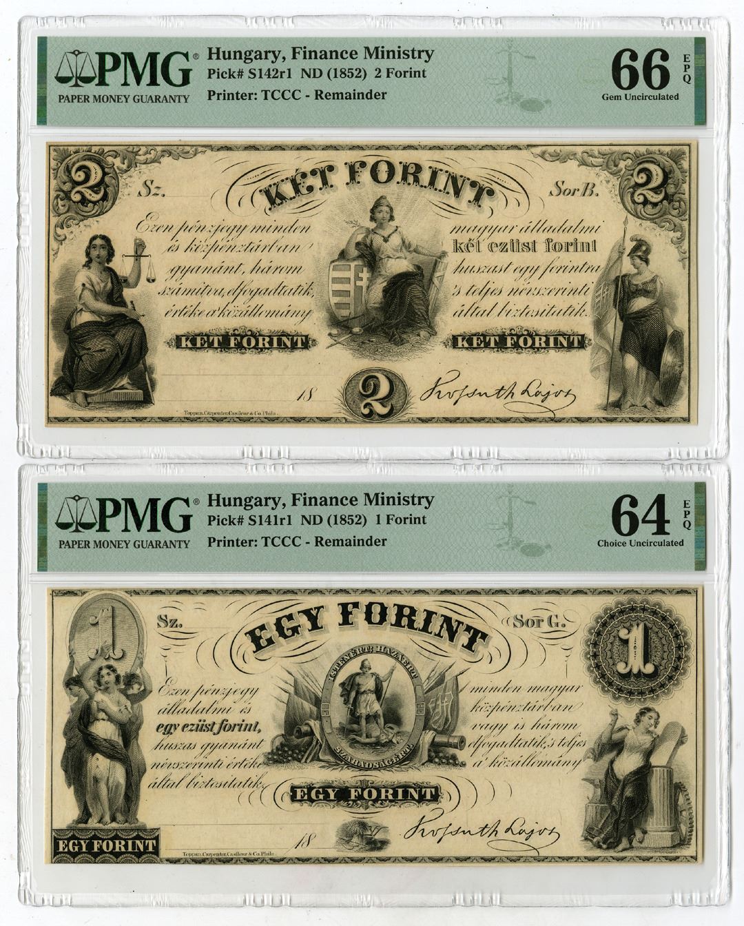 Hungary, ND (1852). Lot 2 Issued Banknotes: 1 Forint, P-S141r1 and 2 Forint, P-S142r1, Pair of Issued Banknotes, Both have black printing with allegorical figures, Both notes are PMG graded, 1 Forint in Choice Unc 64 EPQ & 2 Forint is Gem Unc 66 EPQ, TCCC. (2). Sold "AS IS" no returns accepted.