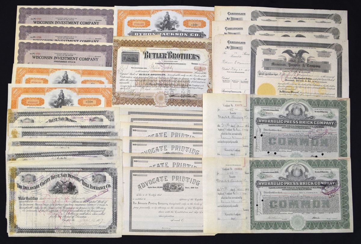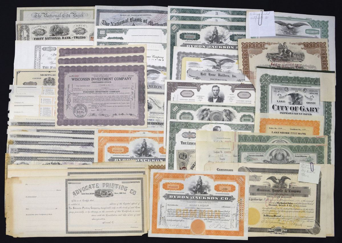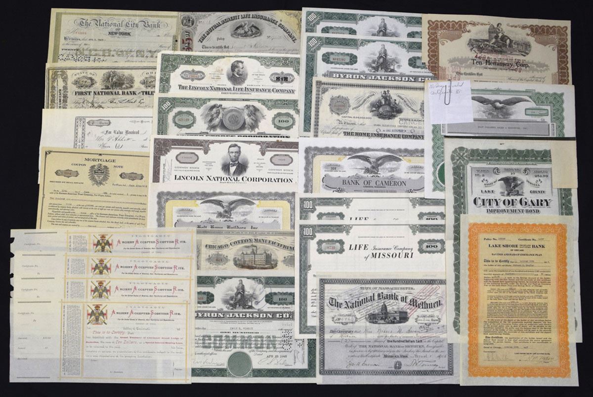 Various States, ca. 1870s-1960s. Lot of 50+ Issued, Unissued, Cancelled, and Remainder Stocks and Bonds from a diverse group that includes banks, insurance companies, utilities, and corporate issues. Highlights include The National City Bank of New York, First National Bank of Toledo, The National Bank of Methuen, Bank of Cameron, Lake Shore Trust Bank, Lincoln National Corporation with Abraham Lincoln vignette, Life Insurance Co. of Missouri, Lincoln National Life Insurance Co., The Home Insurance Co., Butler Brothers, Advocate Printing Co., Hydraulic Press Brick Co., Wisconsin Investment Co. (common and preferred), Byron Jackson Co., Ten Hemenway Corp., and Mossman, Yarnelle & Co. Notably included are a City of Gary Improvement Bond, a Mortgage Coupon Note, and several ornate fraternal pieces from Ancient Accepted Scottish Rite. A variety of border colors are present, with vignettes ranging from allegorical figures to bank buildings and eagles. Condition averages Fine to AU. (50+). Sold "AS IS" no returns accepted.