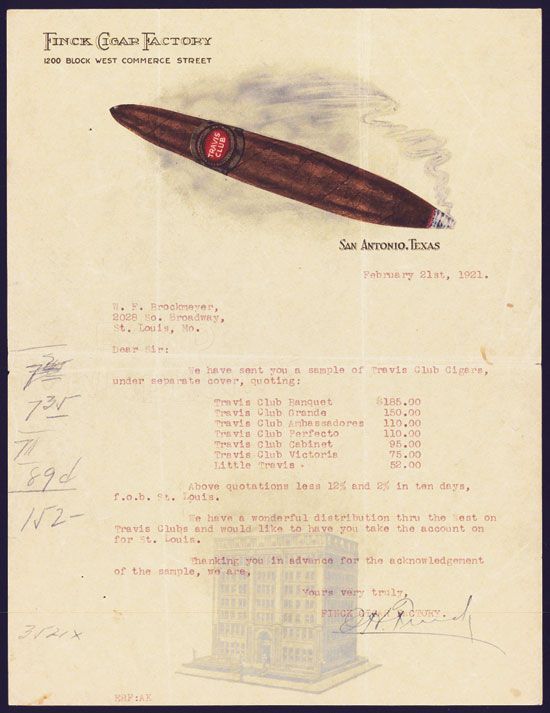San Antonio Texas, 1921, Full color letterhead to prospective distributor in St. Louis quoting prices and terms with a nice full-color image of lit cigar at top and underprint of factory at bottom. VF condition.
