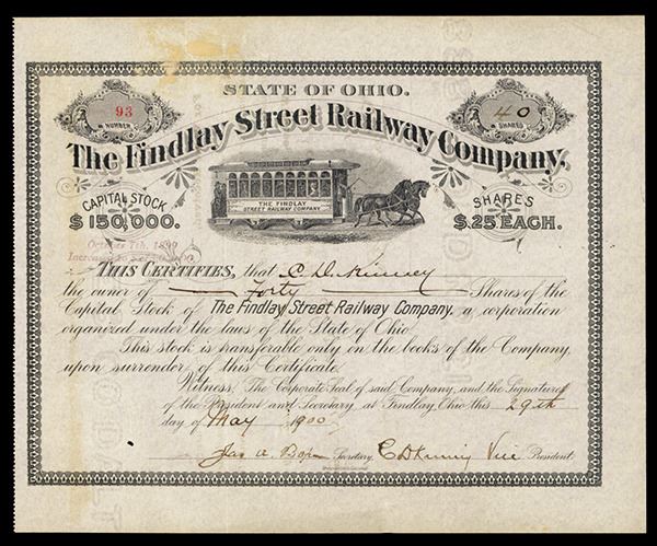 Findlay, Ohio. 1900. 40 Shares, #93, Black, Horse drawn Street Car with company name on side, Issued and uncancelled. Appears VF+ to XF but there is a little glue and paper remnant that could possibly be soaked off if desired. Very rare and unlisted in Cox, Ohio railroad with great horse drawn street car vignette