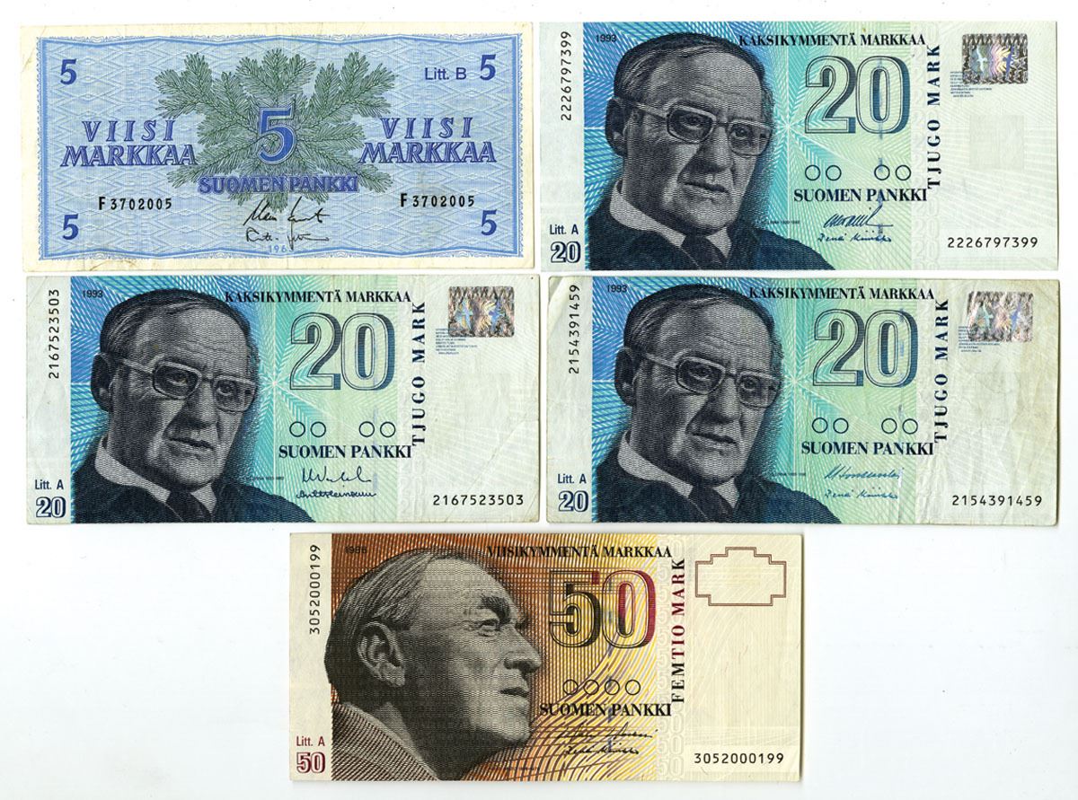 Finland, 1963-1993 (1997). Lot of 4 Issued Banknotes, Includes: 1963, 5 Markaa, P-106Aa; 1986, 50 Markaa, P-114a; 1993, 20 Markaa, P-122; 1993 (1997), 20 Markaa, P-123. Notes range from VF to XF condition. (4). Sold "AS IS" no returns accepted.